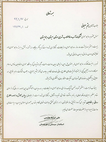 دریافت لوح تقدیر توسط سرپرست امور آبفا زاهدان |