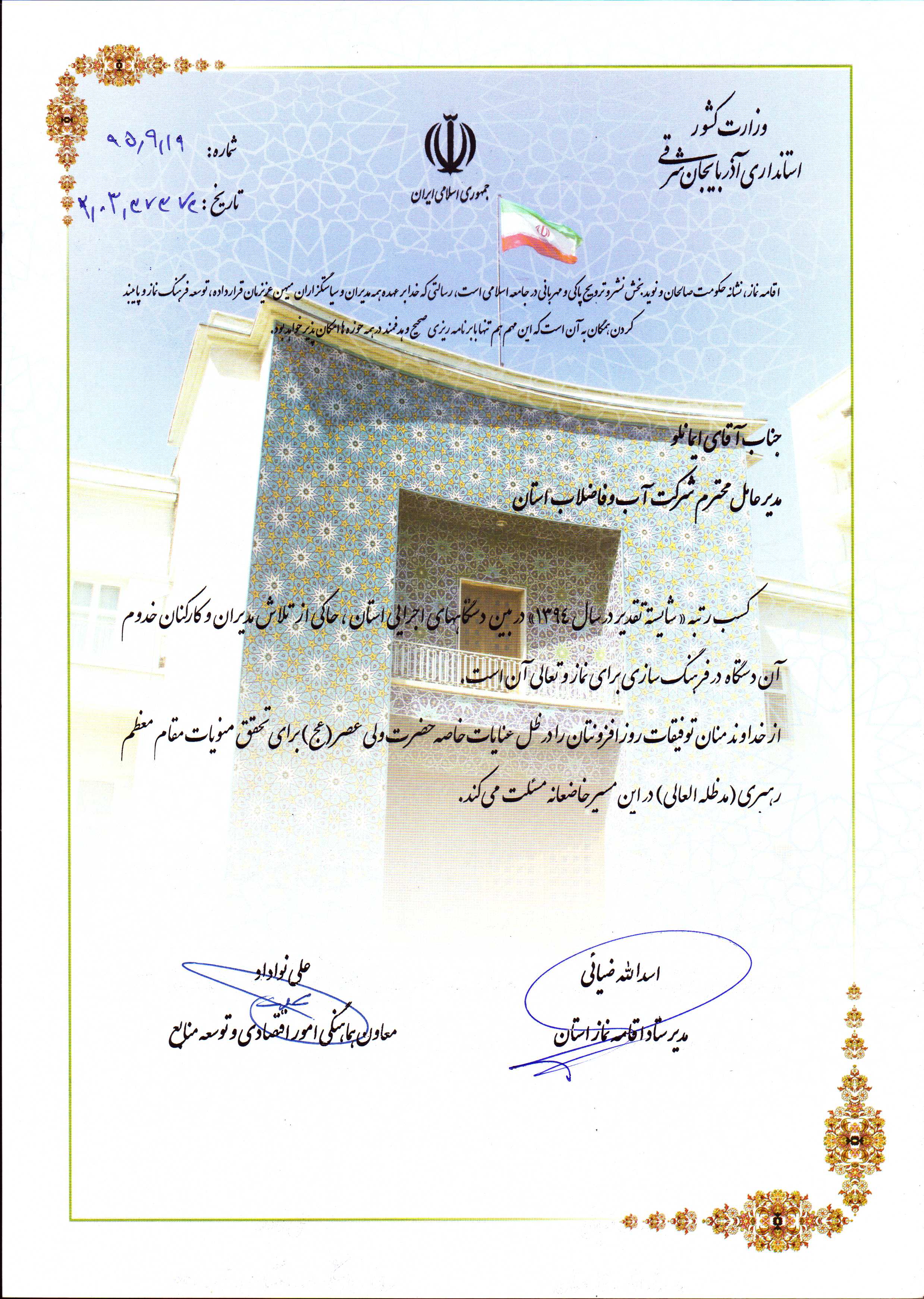 قدردانی معاون استانداراز مدیر عامل |