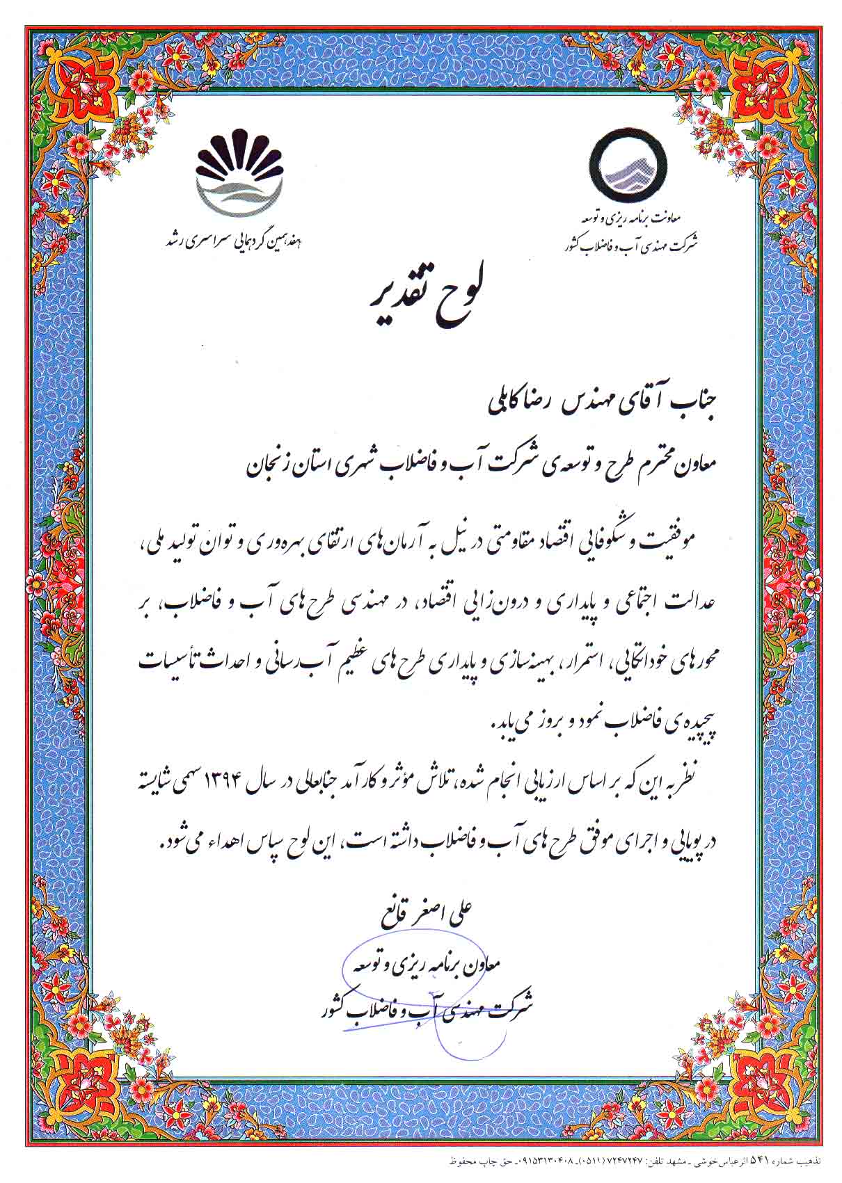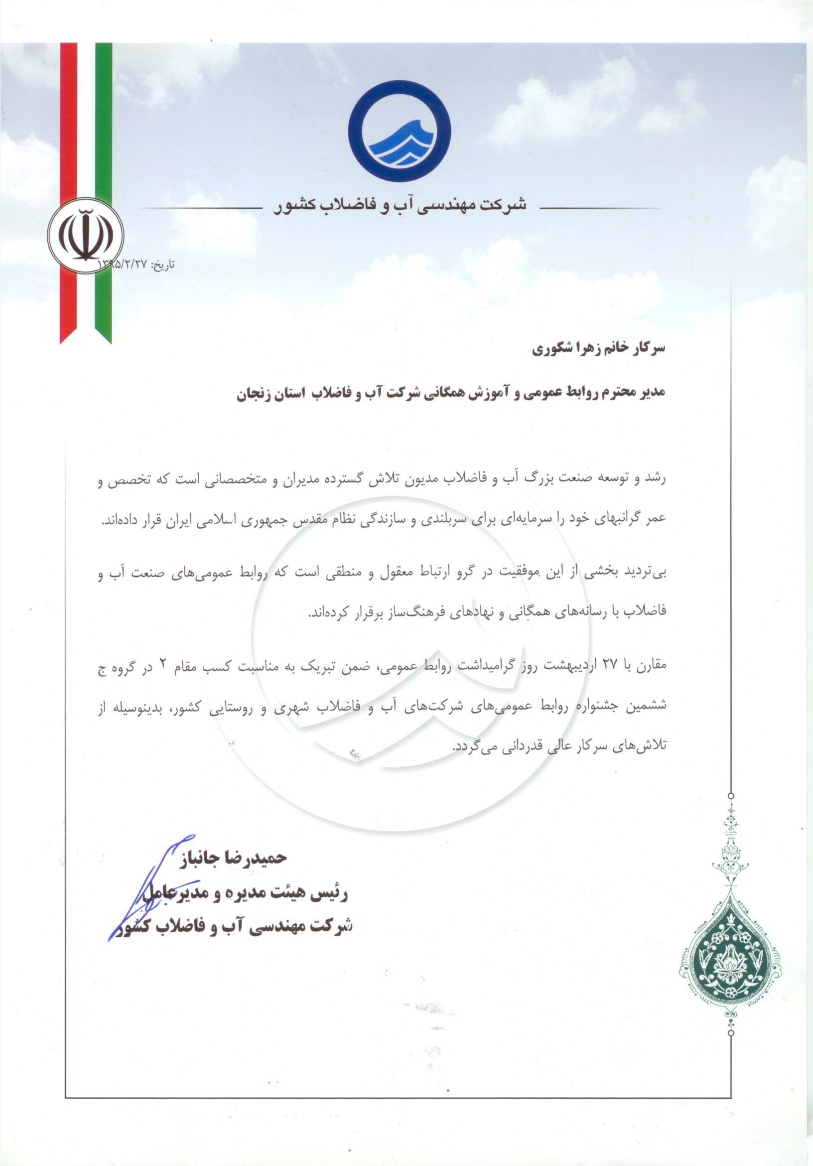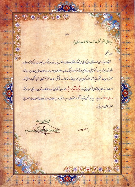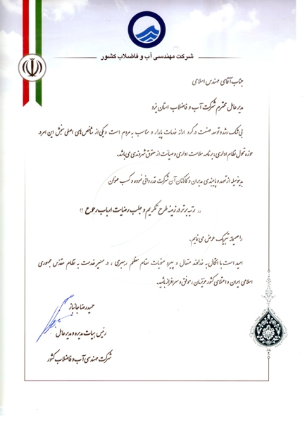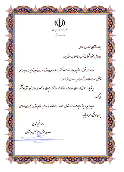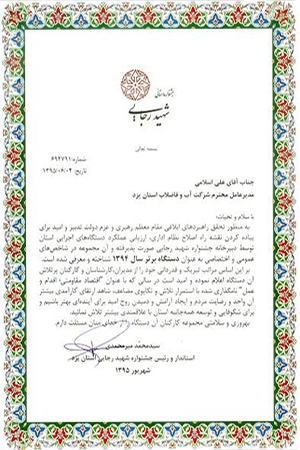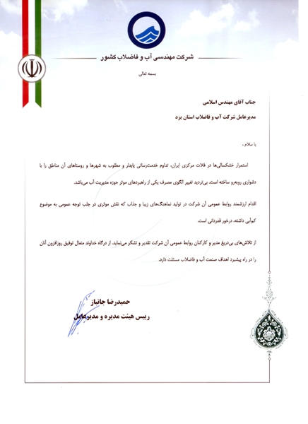 تقدیر از عملکرد شرکت در موضوع کم آبی |