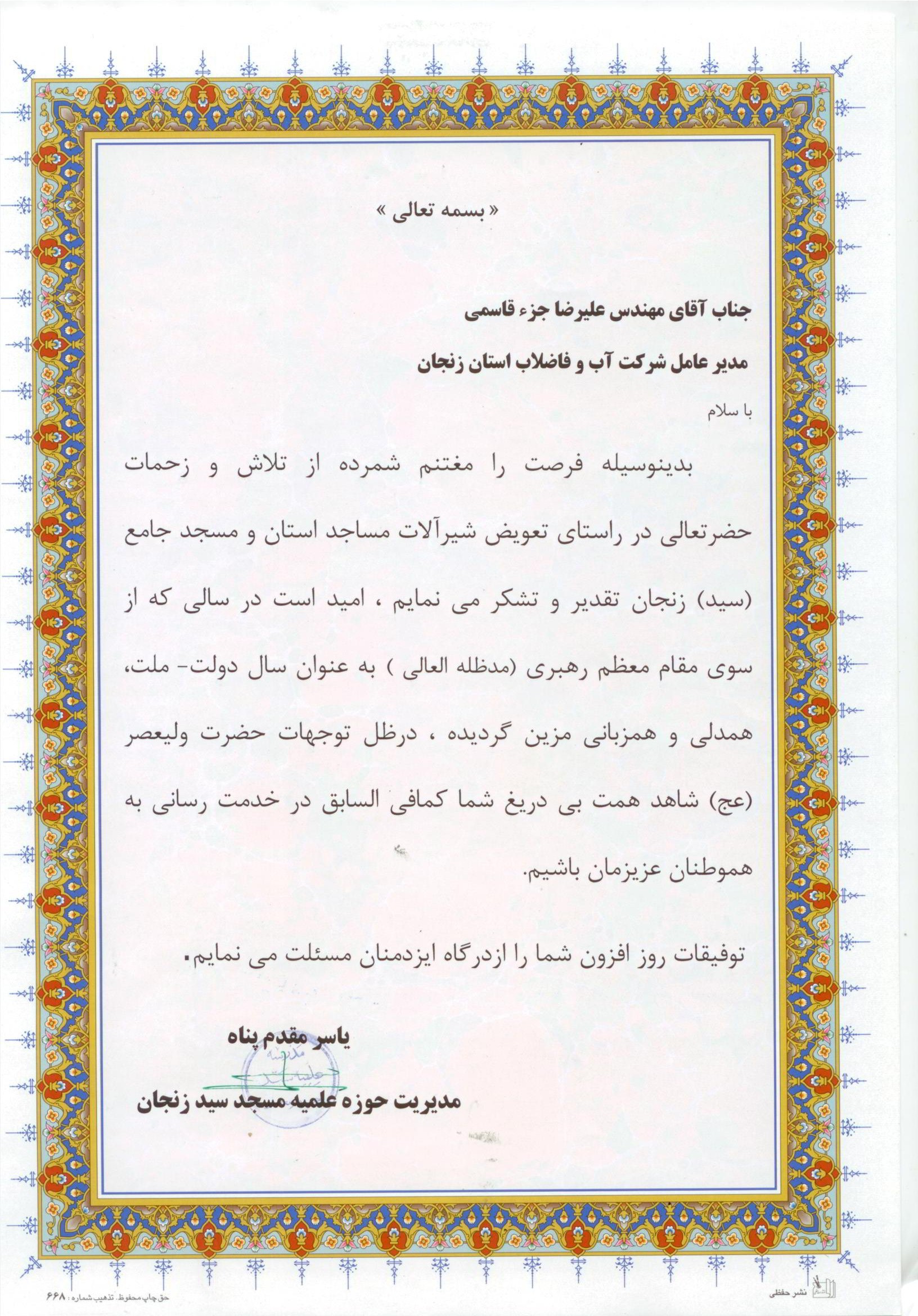 تقدیر از مدیر عامل در زمینه امور فرهنگی |
