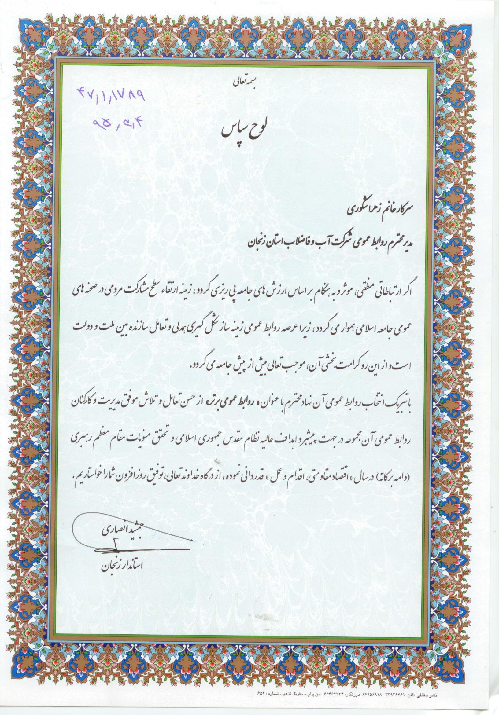 دریافت لوح از استاندار به مناسبت روابط عمومی برتر |