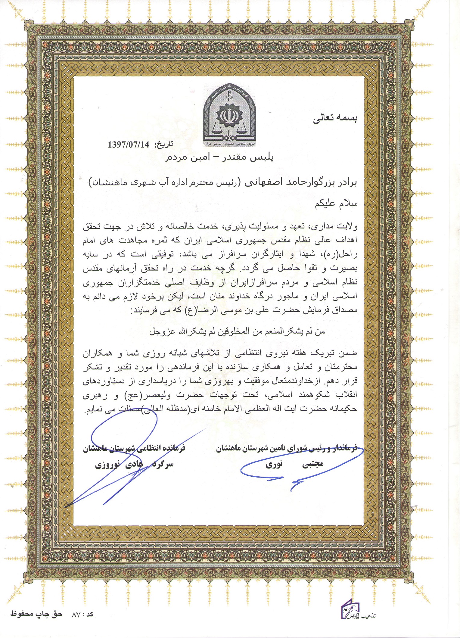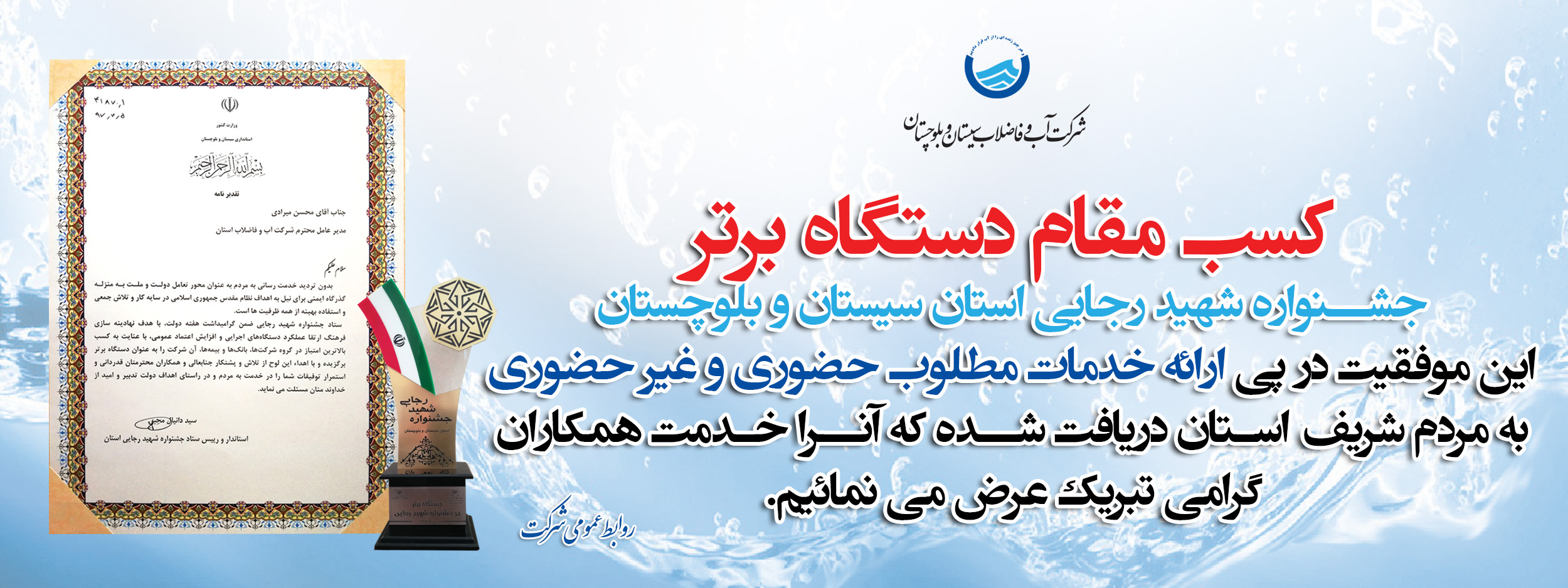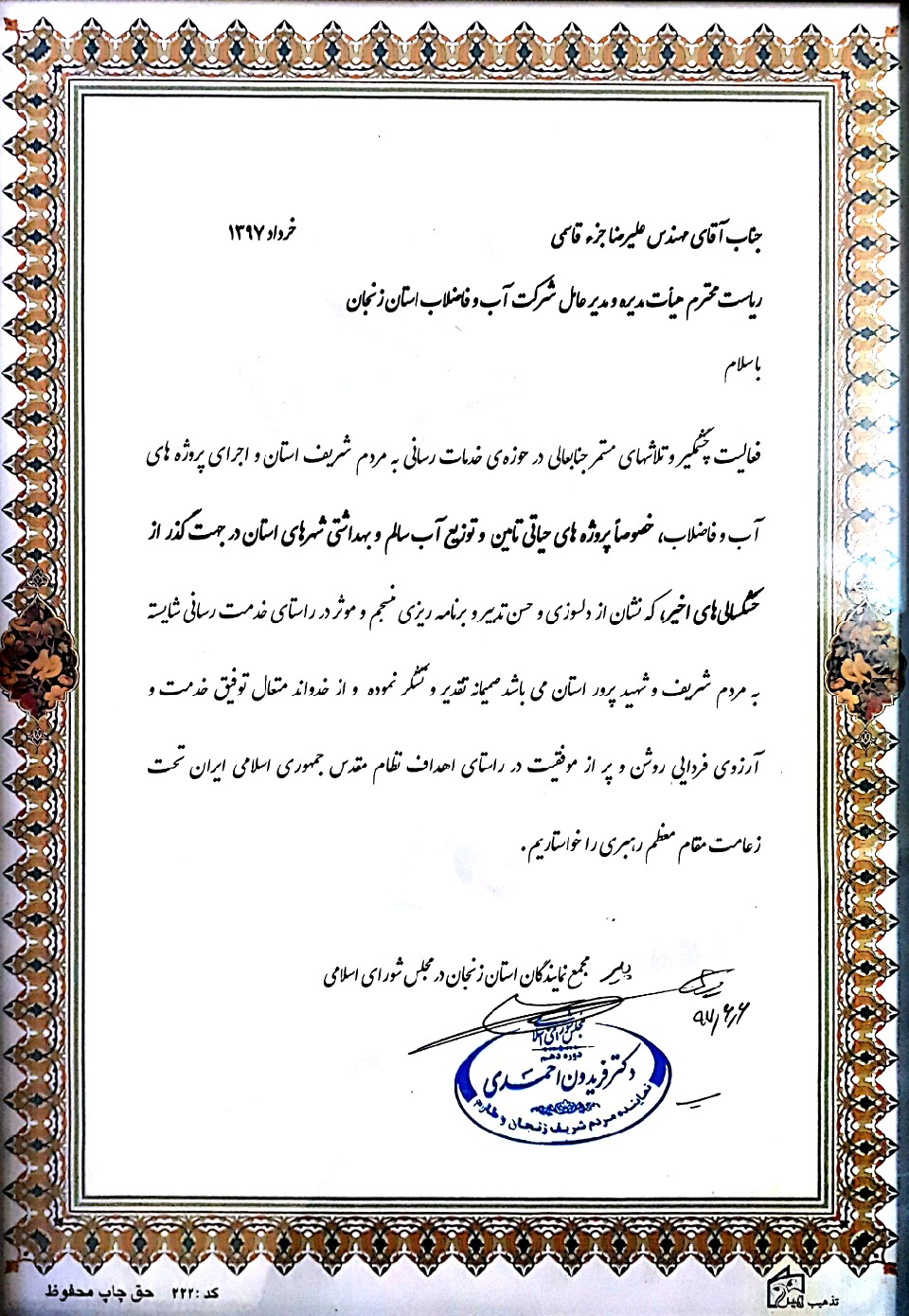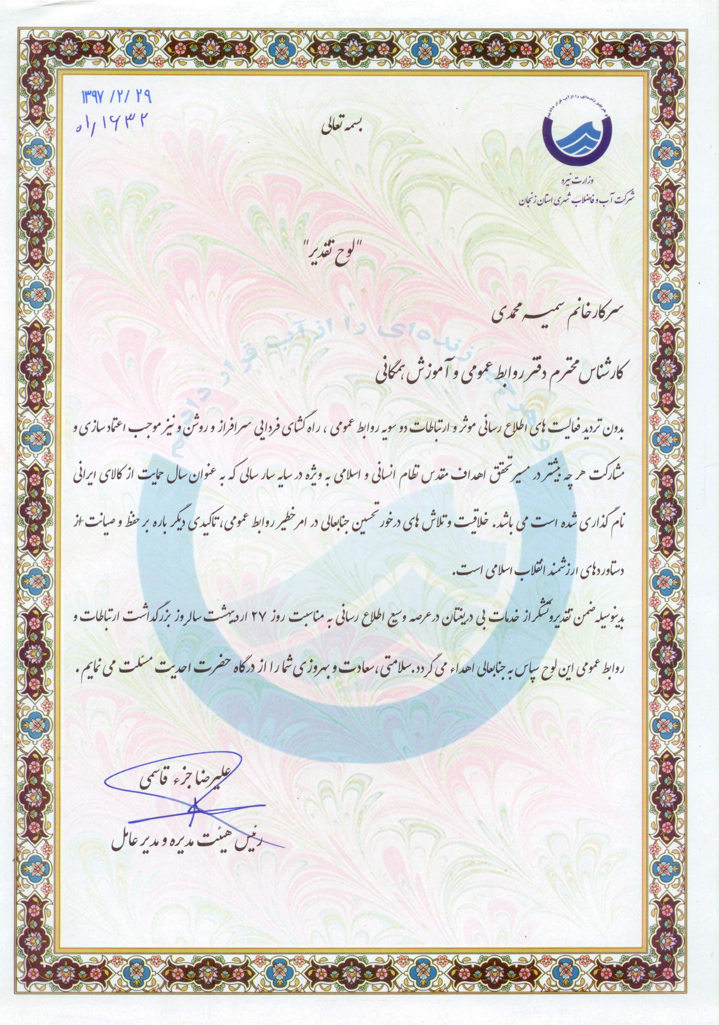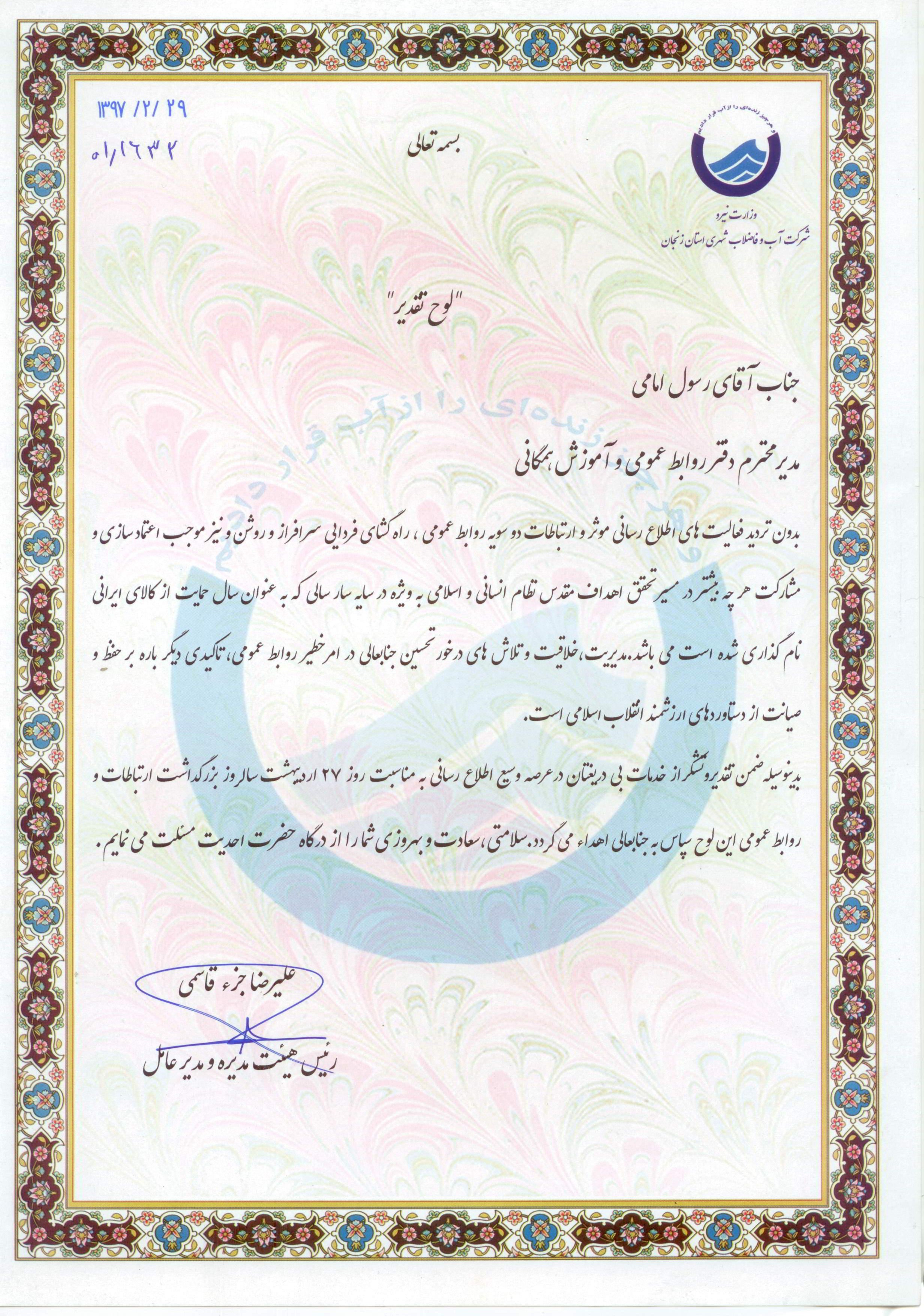تقدیر فرماندار ماهنشان از شرکت آبفای ماهنشان |
