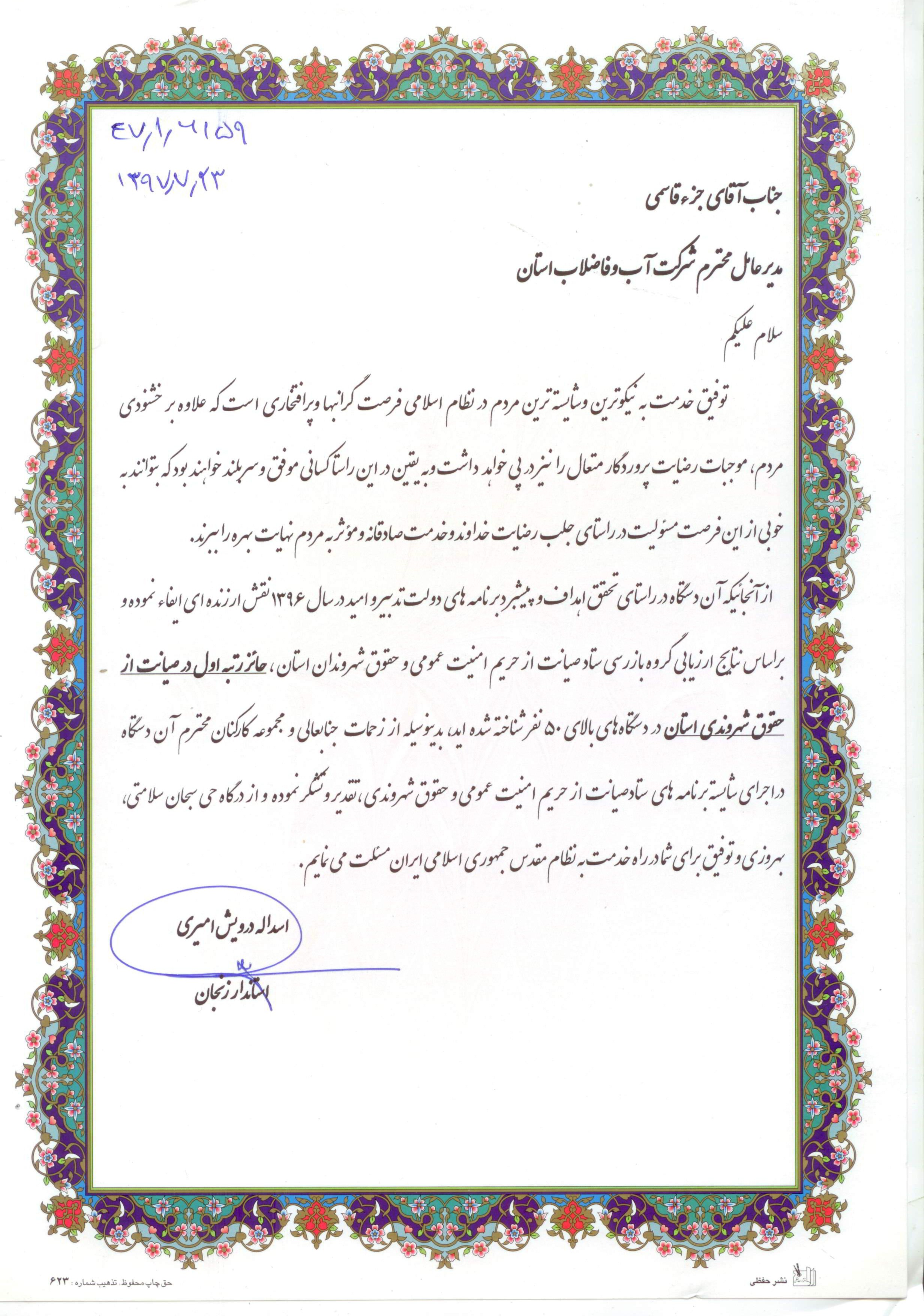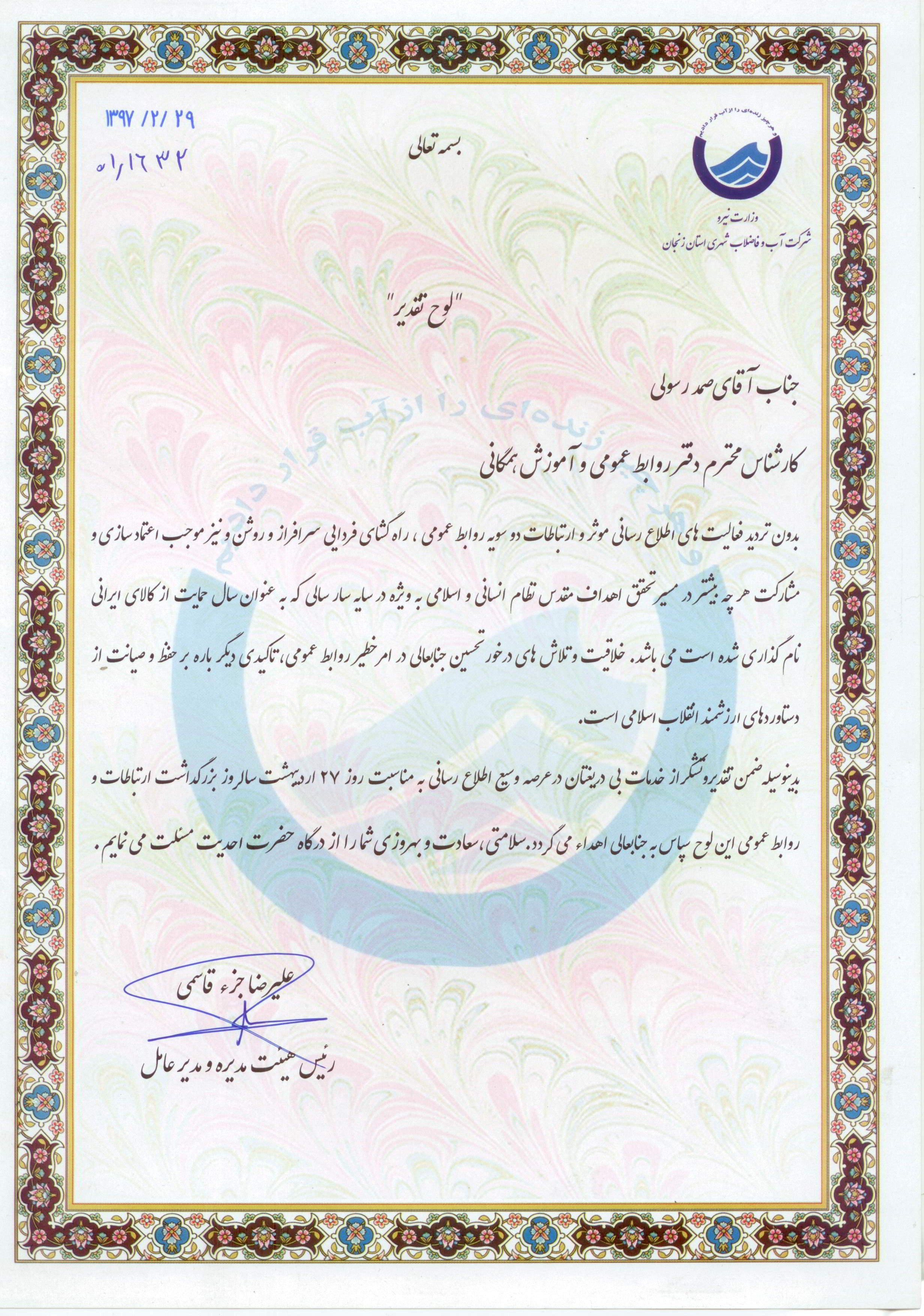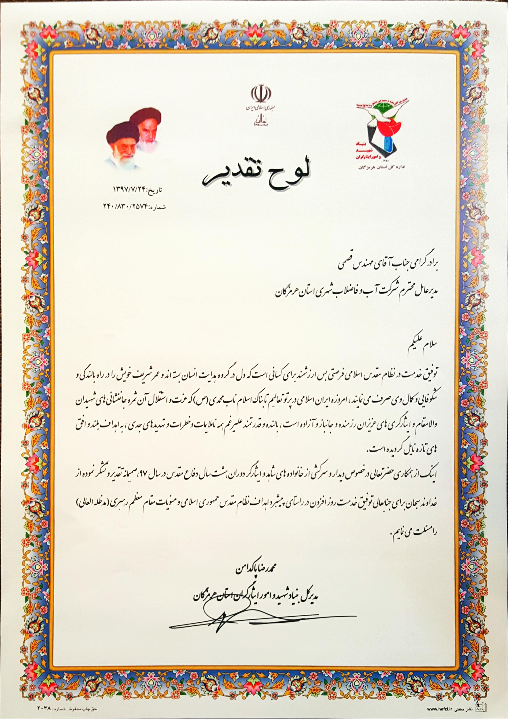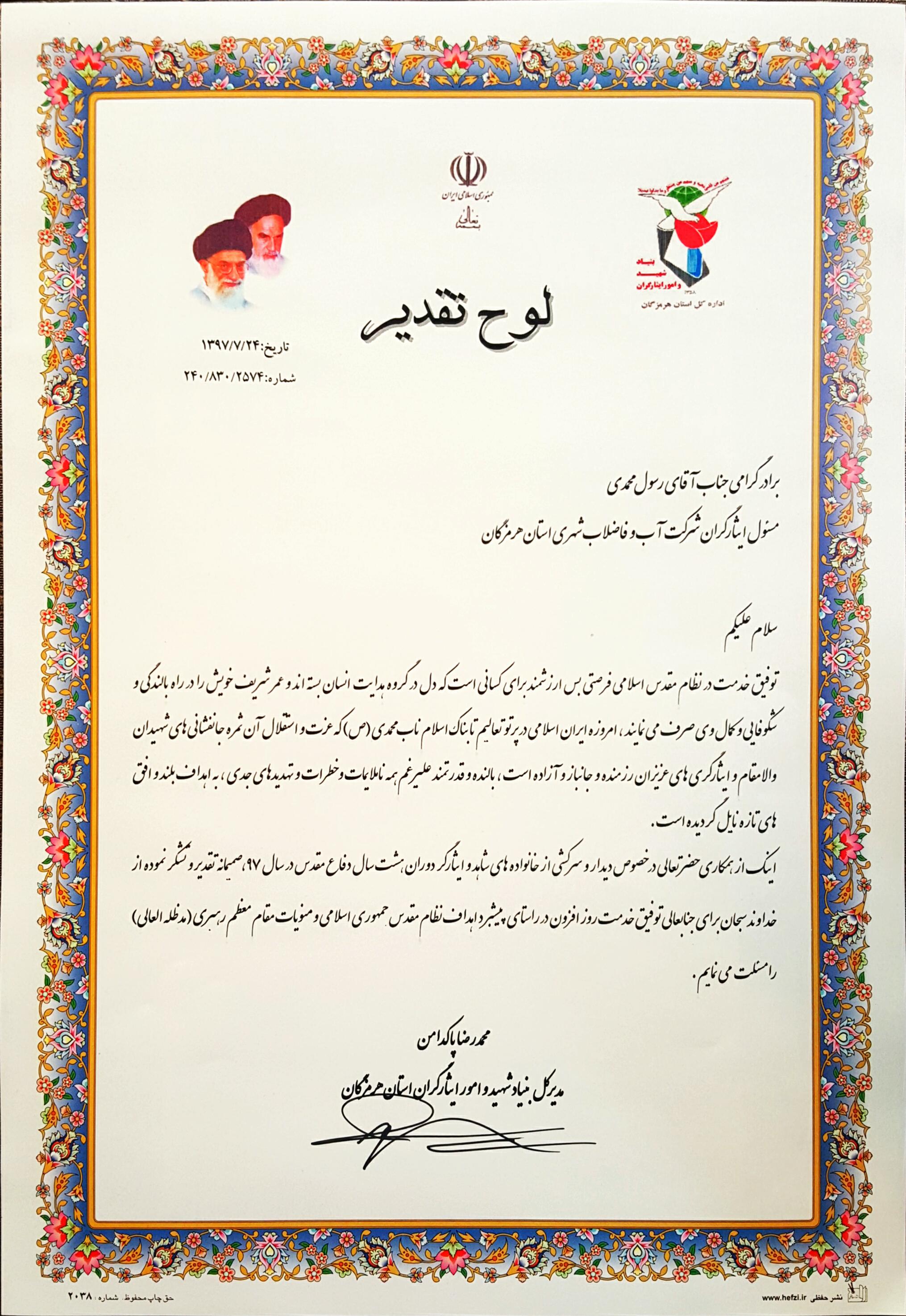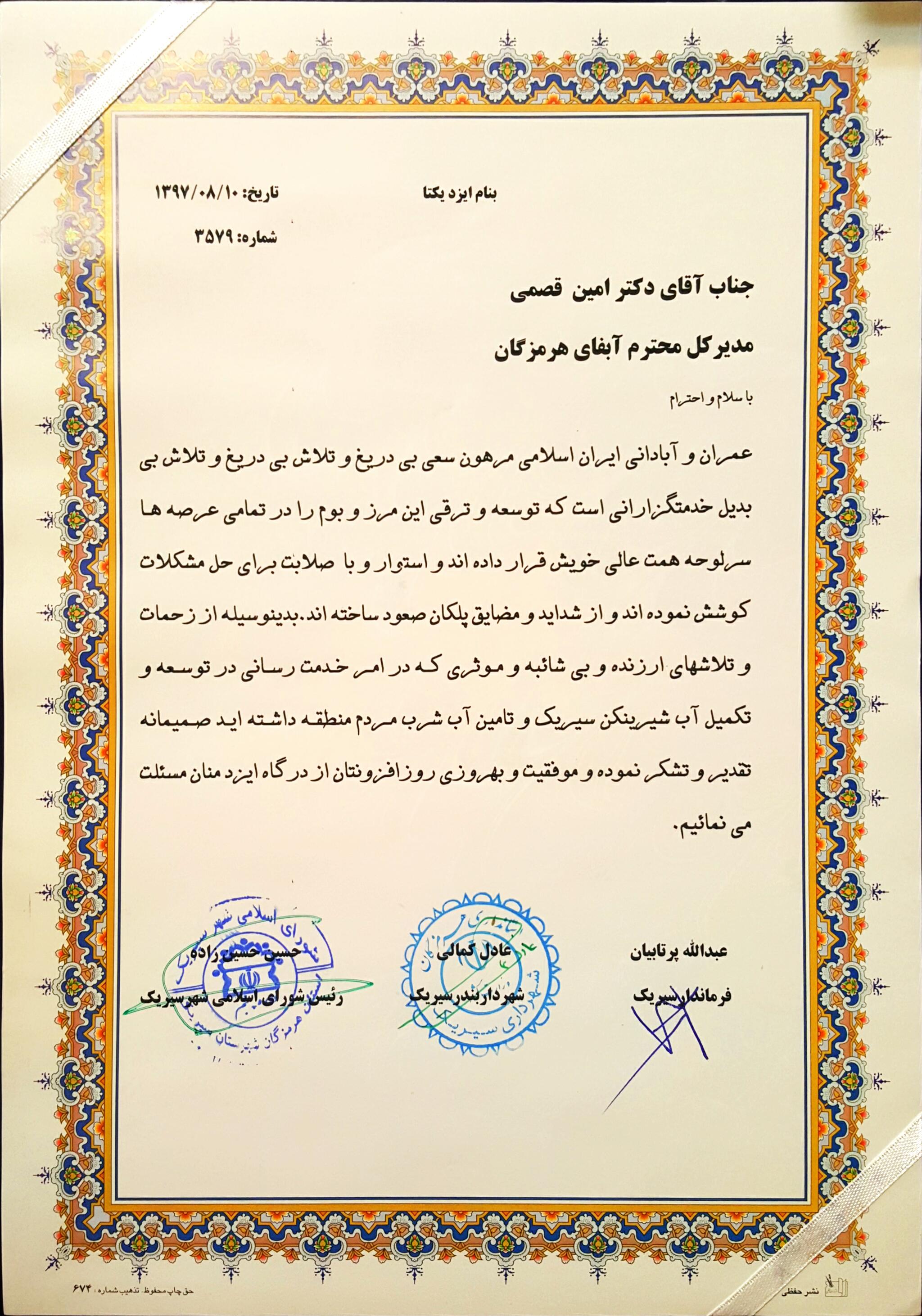 تقدیر فرماندار سیریک از مدیر عامل |