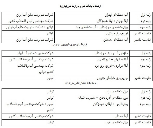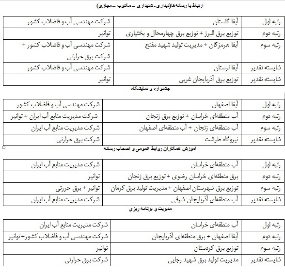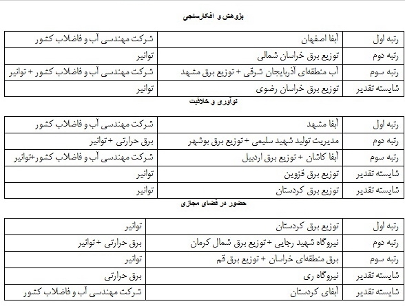 در آیین پایانی این جشنواره که امروز شنبه به صورت ویدئو کنفرانس برگزار شد، برترینهای صنعت آب و برق در موضوعات مختلف به شرح ذیل معرفی و از آنها تقدیر شد.